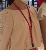 彼の首元には「赤いネックストラップ」の社員証がかけられていました。黒いプラスティックのコードストッパーのようなものが複数ついているのが特徴的です。