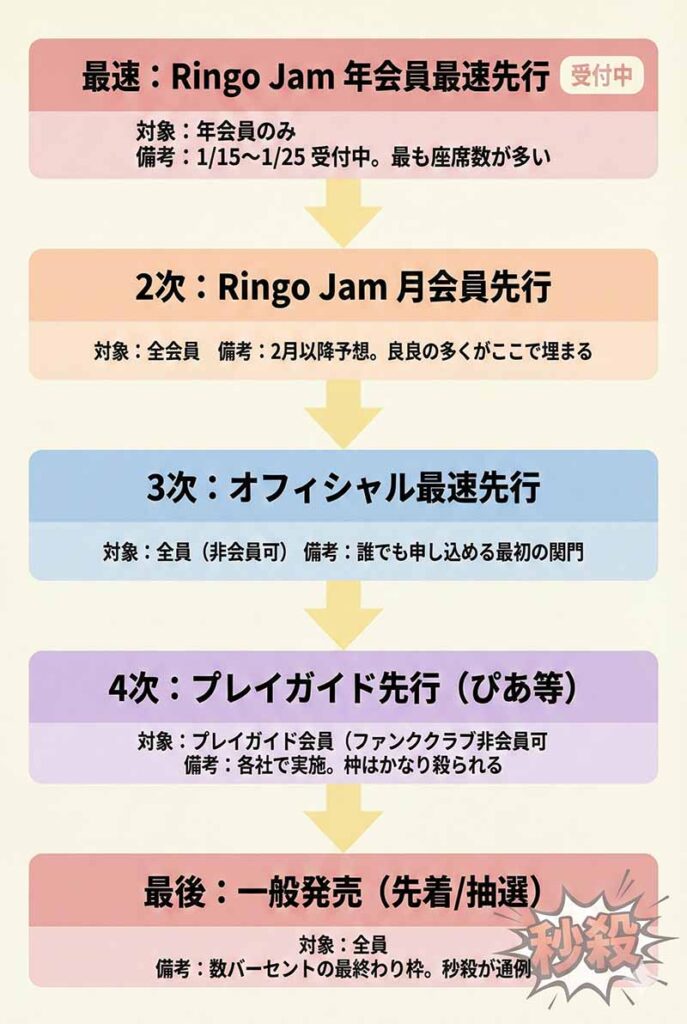 | 最速 | Ringo Jam 年会員最速先行 | 年会員のみ | 1/15〜1/25 受付中。最も座席数が多い |