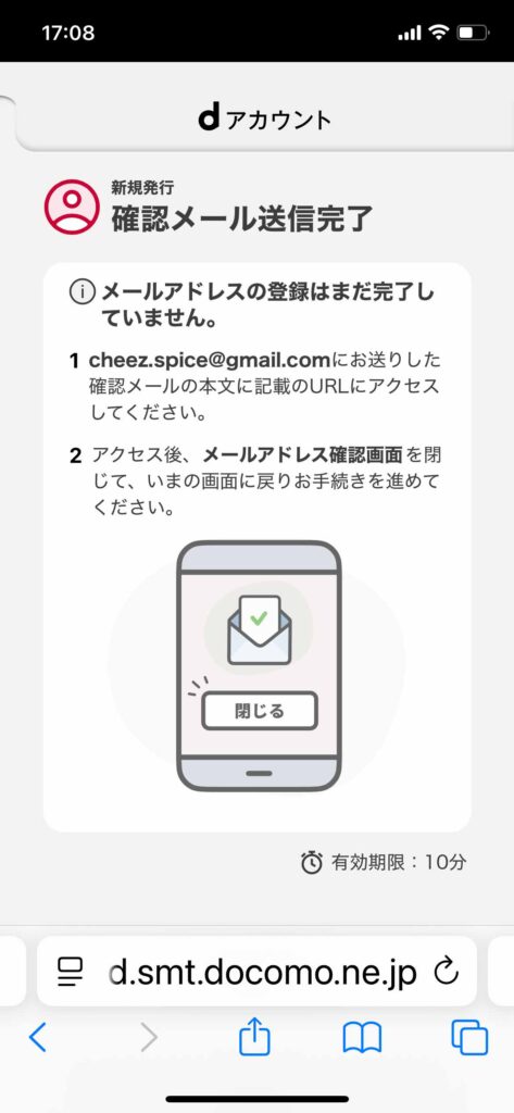 5️⃣ 登録したメルアドにinfo@wdy.docomo.ne.jpからdアカウントの発行が完了しました。 というメールが届いたら完了です。