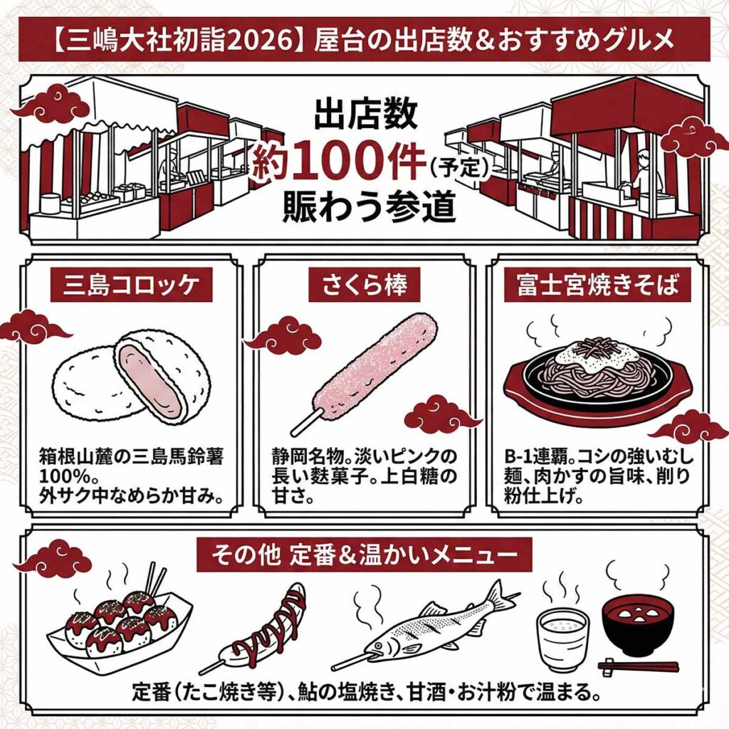 屋台は1月1日〜11日頃まで出店し、たこ焼きや焼きそばの定番に加え、地元名物の三島コロッケやさくら棒も味わえます。