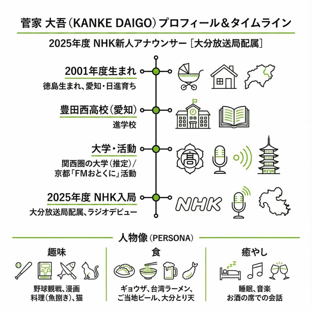 菅家大吾アナは、2025年度にNHK大分放送局へ入局後、早くもラジオニュースの初担当を務め、アナウンサーとしての第一歩を踏み出しました(x.com)。